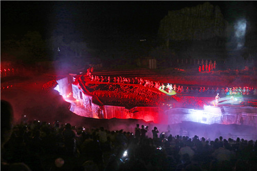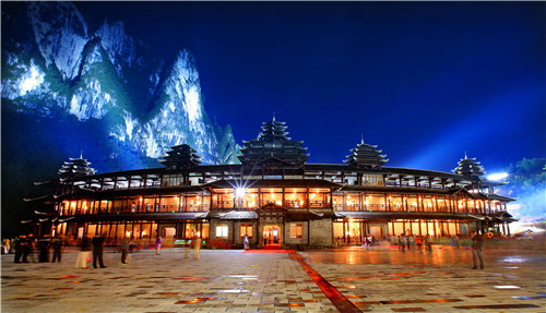 恩施大峡谷实景剧场,用实景音乐剧的形式,以“女儿会”和“龙船调”为民俗音乐背景,讲述一个“追寻真爱”悲喜故事,成为当下旅游演出市场的稀缺奇观。全剧高潮处,通过“山崩”、“地裂”、“河泻”、“日天”……等一系列撼天动地的“爱情飓风”,让大峡谷众多标志性景观,在故事、剧情、人物发展关键处,联袂形成情感引爆点,让观众感动落泪的同时,亦忍俊不禁扪心自问!