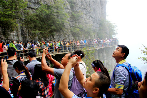 图为“十一”期间恩施大峡谷七星寨景区绝壁栈道的观景人群