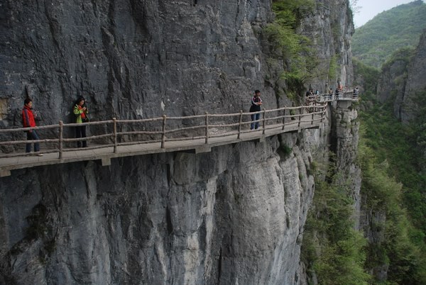 绝壁,一点不错,上是绝壁下是悬崖,我们还能看到当施工人员留下的铁钎挂环,修这条长500米的栈道真的不容易,栈道最大落差400多米,看上去是很危险的,由于我有在上