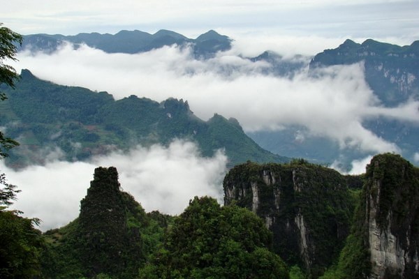 海东方明珠塔顶行走的经历,所以没觉得有什么,妻说同行的有个小伙子怕的要死,要回头去走另一条路绕过去,其实妻也很害怕,她的手都是凉的,我安慰她说贴着“墙”走会感觉安全许多,栈道下面许多地方有石山支着很稳的。长廊,不够贴切,长度是还可以有500米,我认为这条栈道还是一个画廊,整个栈道的右手边都是一幅幅美丽的山水画,而且还是一幅幅动态的画卷,随着云雾的移动,远近的山若隐若现,一会还清清楚楚地在眼前,拿出相机准备拍照,一转身,背后的景色却变了,有一次帮我照相的朋友告诉我只照到了雾,我觉得很奇怪,不会吧,刚刚我才选好景呢,再转身看,可不,真的只有雾,山在雾里树也在雾里,一点也看不清了。边走边拍,不一会儿有导游告诉他们的团员,到头了,几个年轻人大叫还没过足瘾呢,我告诉他们,可以从后面转回去再走一遍呀。